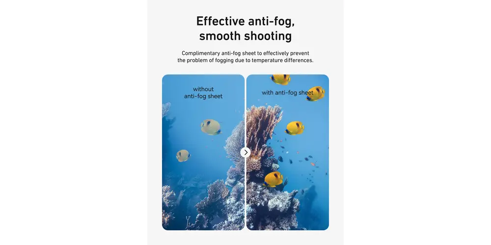 داخل بسته یک پد ضدبخار (Anti-Fog) قرار دارد که از ایجاد بخار ناشی از اختلاف دما جلوگیری میکند. بنابراین حتی در آب سرد یا هنگام تغییر ناگهانی دما، تصویری شفاف خواهید داشت.